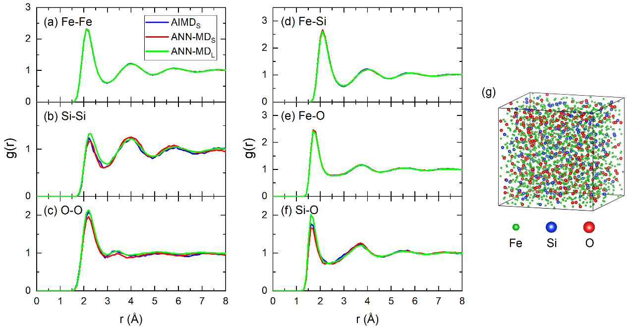 张超教授团队,与美国爱荷华州立大学的Cai-ZhuangWang教授团队和美国哥伦比亚大学Renata Wentzcovitch教授团队合作,采用基于机器学习的人工智能神经网络和基于密度泛函理论的第一性原理相结合的方法,构造了适用于地球内核高温高压条件下的Fe-Si-O原子间势函数。基于人工智能神经网络的原子间势函数不仅具有密度泛函理论的精度,同时又兼顾计算效率。张超教授团队采用该原子间势函数对Fe-Si-O体系进行了大尺寸和长时间的分子动力学研究,结果表明在高温高压的Fe-Si-O体系中不存在相分离和不相容性。这为解决该体系中存在的巨大争议提供了重要理论依据,同时也预示着基于人工智能神经网络的原子间势函数在地球内核条件下的应用前景。