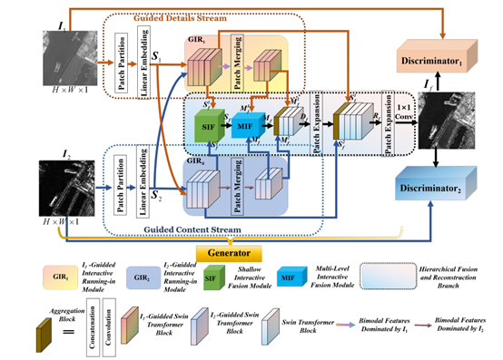 隋晨红副教授的多模态遥感智能感知与认知团队设计开发了一种新的交互式引导生成对抗网络,称为IG-GAN,用于多模态图像融合任务。IG-GAN包括为增强细节和内容的学习以及跨模态一致性量身定制的引导双流。此外,为了使融合网络能够在没有监督的情况下生成内容完整、边缘锐利、保真度高的融合图像,还建立了一个损失函数,便于生成器和两个鉴别器之间相互博弈。结果表明,IG-GAN可以通过整合不同模态的互补信息来提高目标检测的精度。