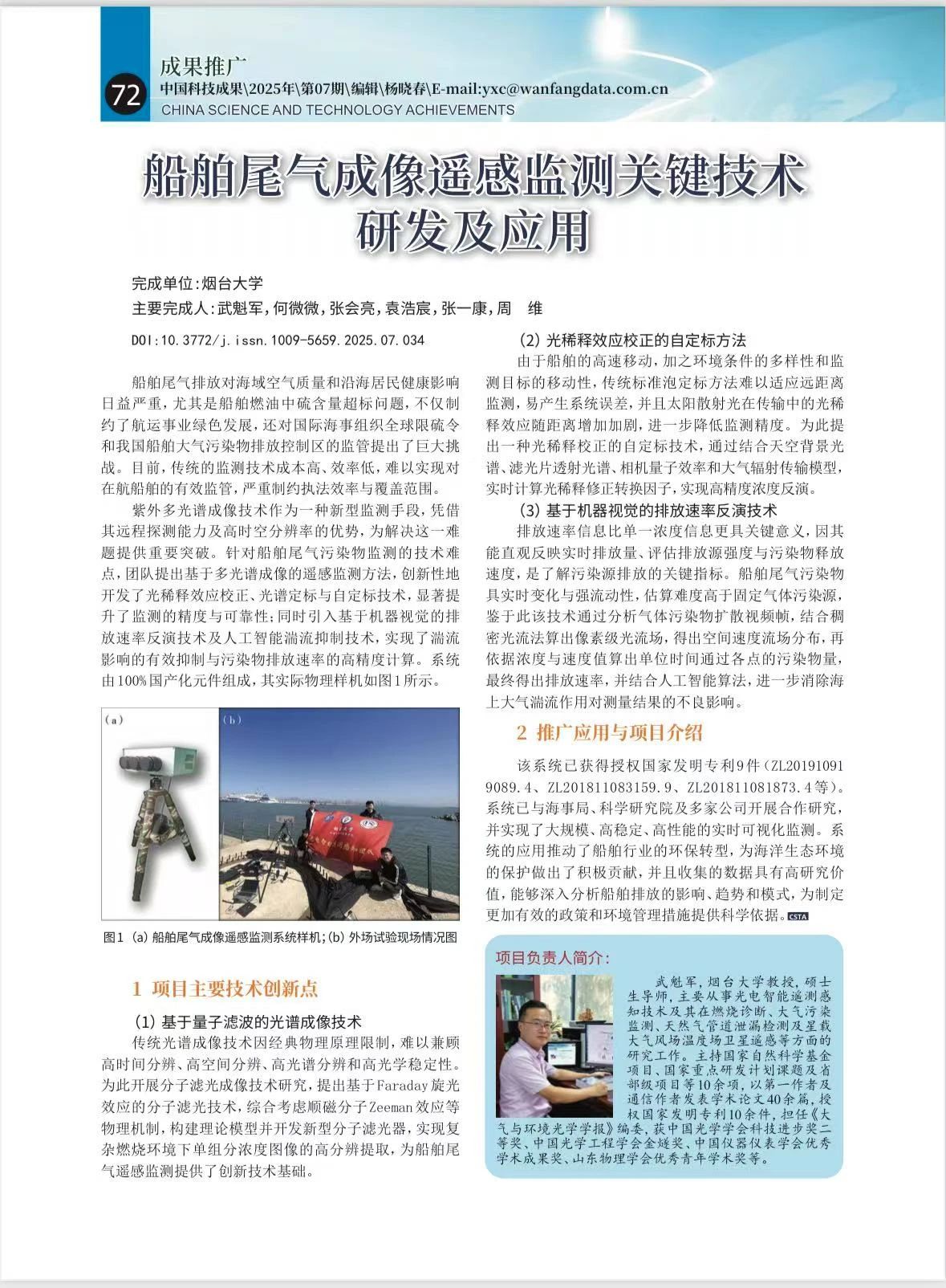 光电智能遥测感知团队自主研发的“船舶尾气污染物成像遥感监测系统”获国家级学术期刊《中国科技成果》(2025年4月,第26卷)专题报道。该成果通过高精度光学成像与人工智能技术,实现对海上船舶尾气污染的实时动态监测,让移动污染源无所遁形,被誉为守护海洋环境的“电子眼”,标志着我国在船舶尾气治理领域取得重要突破。