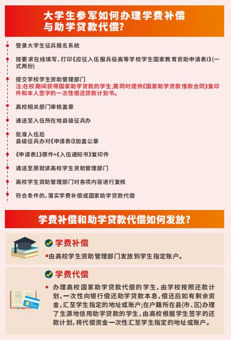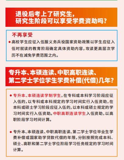 1.国家对应征入伍服兵役的高校学生,在入伍时对其在校期间缴纳的学费实行一次性补偿或获得的国家助学贷款实行代偿;应征入伍服兵役前正在高等学校就读的学生(含高校新生),退役后自愿复学或入学的,国家实行学费减免。