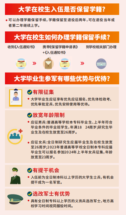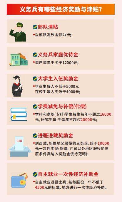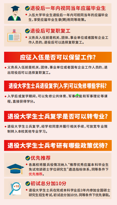 4.入伍大学生按规定享受优待政策,义务兵家庭优待金由批准入伍地发放,其家庭享受军属待遇。