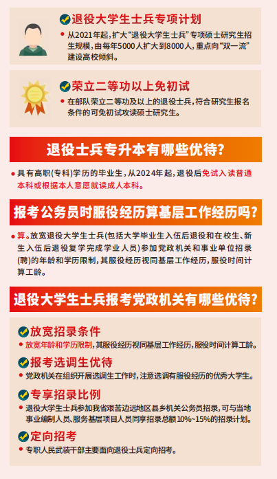 3.设立“退役大学生士兵专项硕士研究生招生计划”,专门招收退役大学生士兵攻读硕士研究生。2021年起每年安排计划8000人。