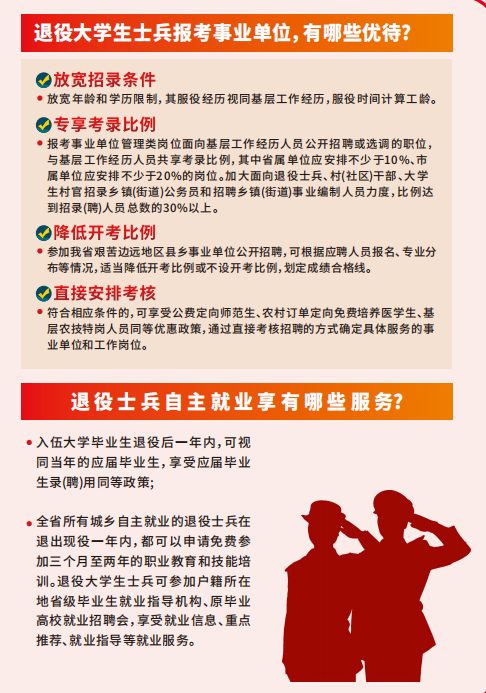 3.乡镇补充干部、基层专职武装干部配备时,注重从退役大学生士兵中招录;在军队服役5年(含)以上的高校毕业生士兵可以报考面向服务基层项目人员定向考录的职位,优先录用建档立卡贫困户家庭高校毕业生退役士兵。