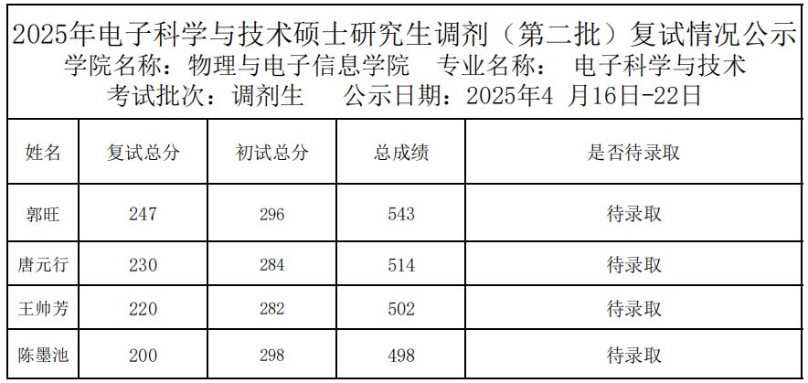 2025年电子科学与技术硕士研究生调剂(第二批)复试情况公示