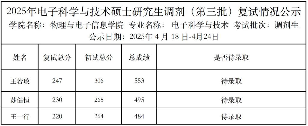 2025年电子科学与技术硕士研究生调剂(第三批)复试情况公示