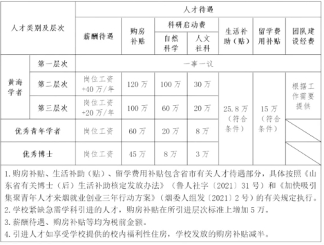 备注:1.学校可根据黄海学者的学科(团队)建设需要提供必要的学科(团队)建设经费;2.达到学校专业技术职务评聘工作实施办法规定的副教授或教授业绩条件的,可聘为副教授或教授;3.根据学科建设发展规划,设定柔性引进岗位。柔性引进的人才待遇,根据其来校工作时间和完成目标任务等情况协议确定。引进的外籍人才待遇,根据具体情况合同约定。