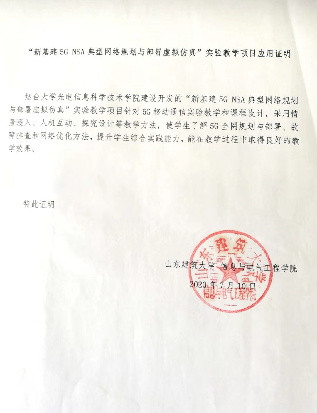 山东建筑大学信息与电气工程学院推广应用证明: