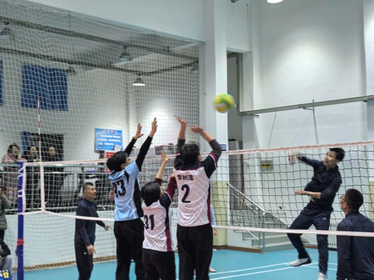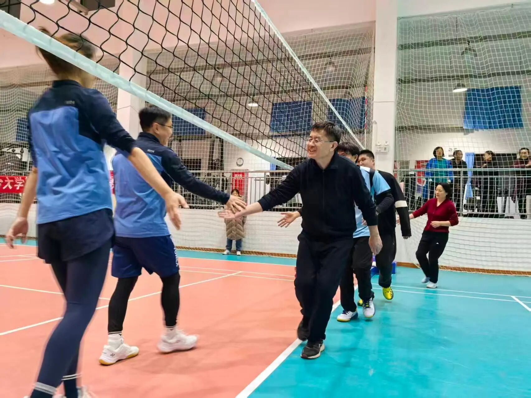 教职工们便以饱满状态投入每一场较量;12月3日与国交学院的对决中,队员们用灵活的走位与精准的发球把控节奏;12月5日迎战药学院时,更是以默契的拦网与快攻将团队协作展现得淋漓尽致。